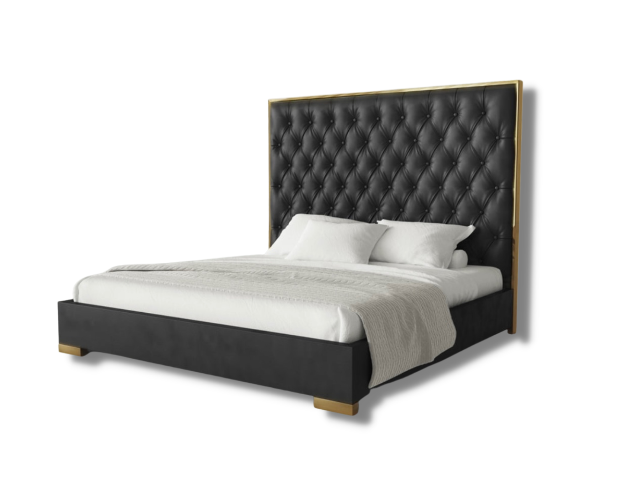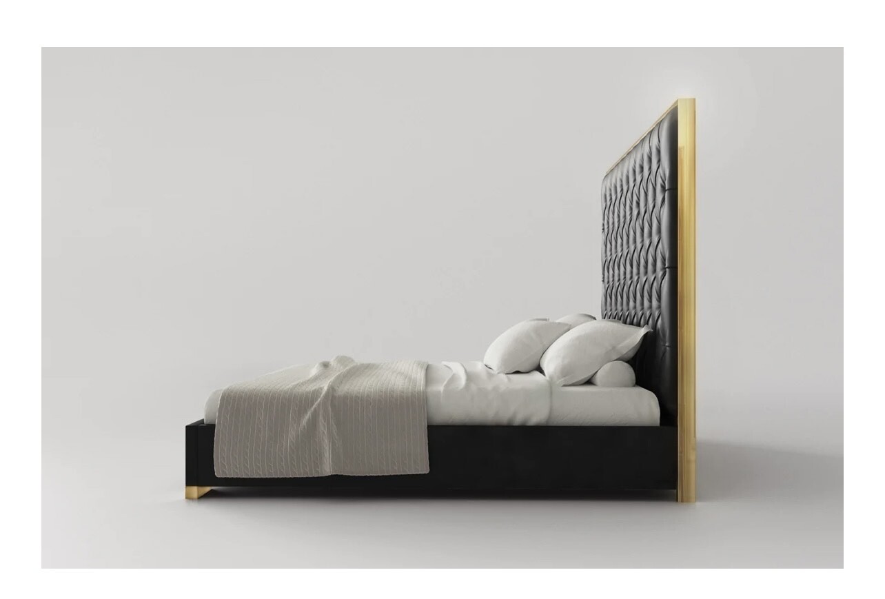 It features a high headboard with gold stainless steel in the headboard frame for that refined look.
