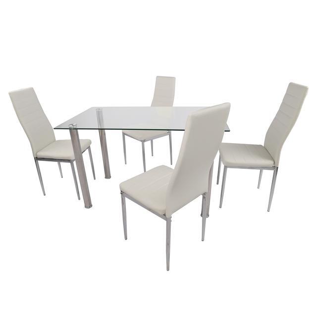 It adopts 8-millimeter tempered glass and high-quality stainless steel, which results in longer product life. And it's easy to clean. For the chairs, it uses leather coated with a film of PU, which is comfortable to seat.